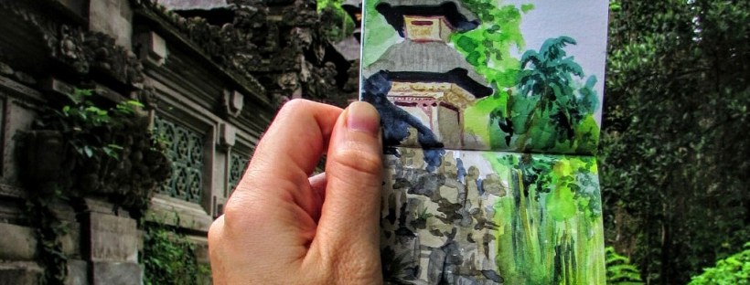 Pen and watercolor sketch of a street lined with penjor (decorations for the holiday of Galungan)